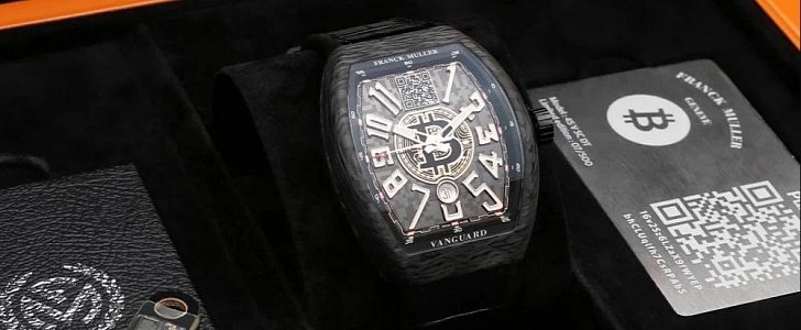 It’s the Franck Muller Vanguard Encrypto, the company itself calls it the “world’s first functional Bitcoin watch”. On the dial, at the 12 o’clock, you’ll find a laser-etched QR code that can be paired to your public wallet address and it also comes with a USB stick that you can use to store your private keys. Production is, or rather was, limited to 500 pieces. And apparently you can only buy it with crypto.