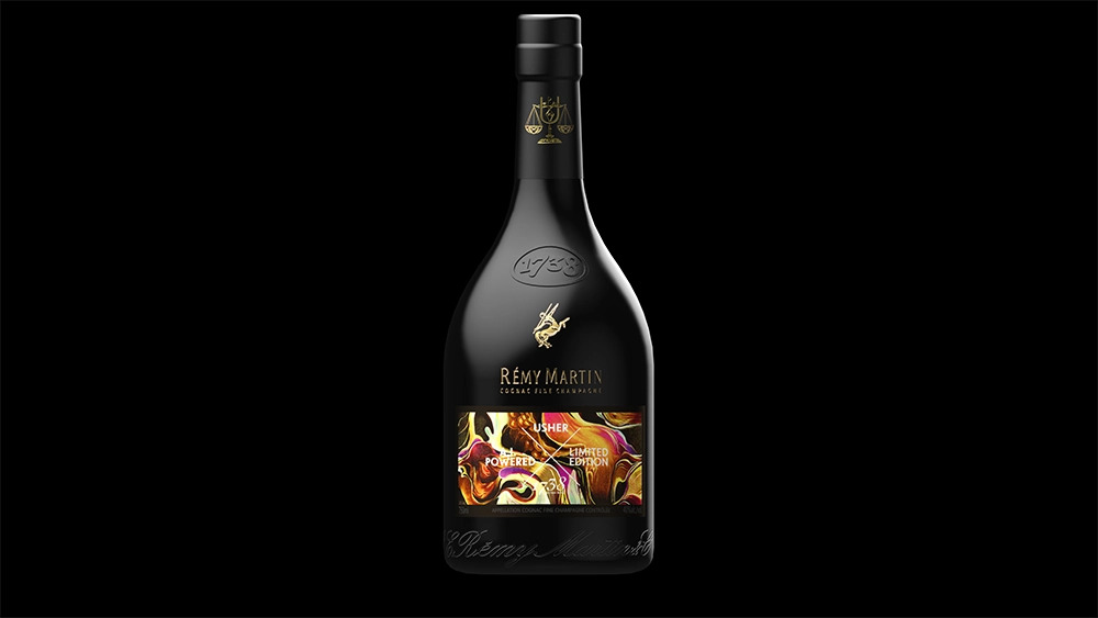 The ‘Usher X 1738 A.I. Powered’ bottle features an all-black design with gold-tone ‘Rémy Martin’ logo and inscription as well as a super colourful label.
