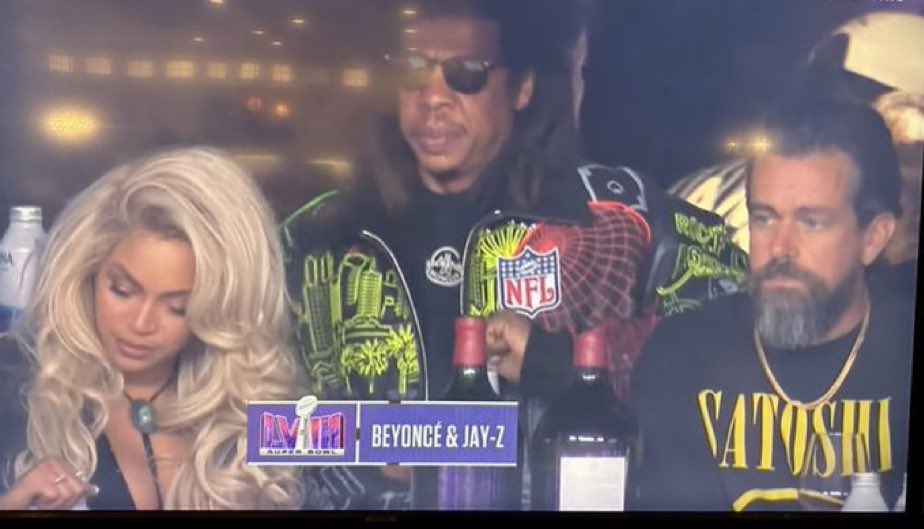 Dorsey, who for whatever reason is usually trying to do everything he can to look like a bum, was wearing a ‘Satoshi’ t-shirt, while watching the sporting event next to fellow billionaires (sort of) Beyonce Knowles and Jay-Z.