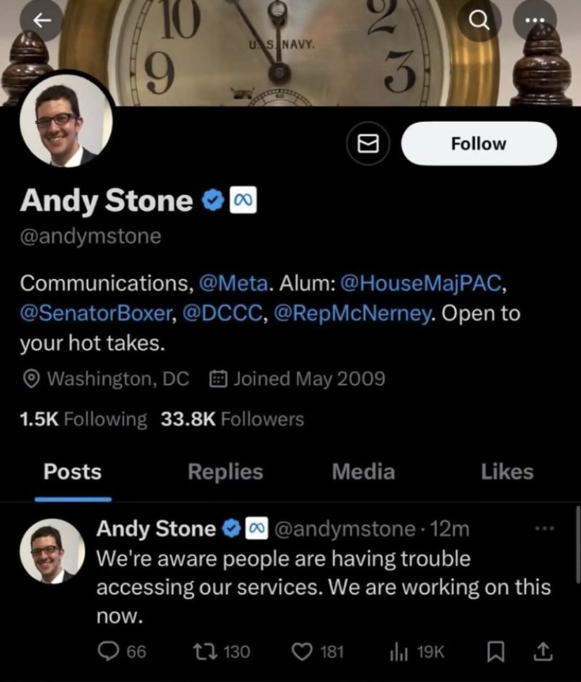 Meta head of communications Andy Stone was forced to use X to address people’s concerns regarding Meta’s glitch.